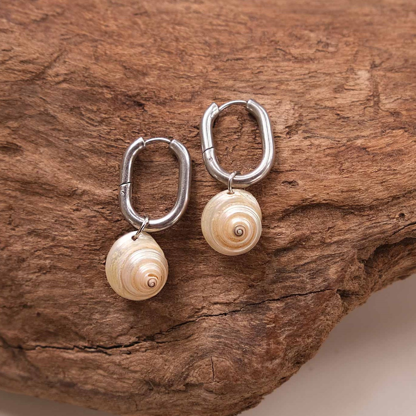 Décore ton visage avec ces anneaux ovales en acier inoxydable argentés, ornés de coquillages nacrés.